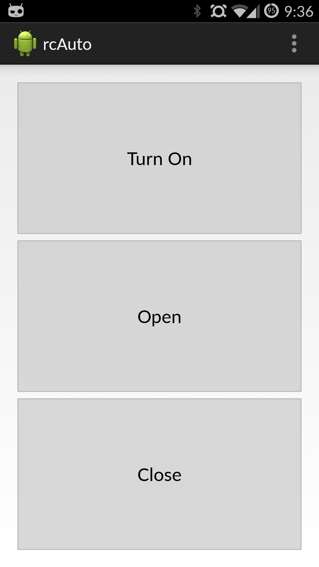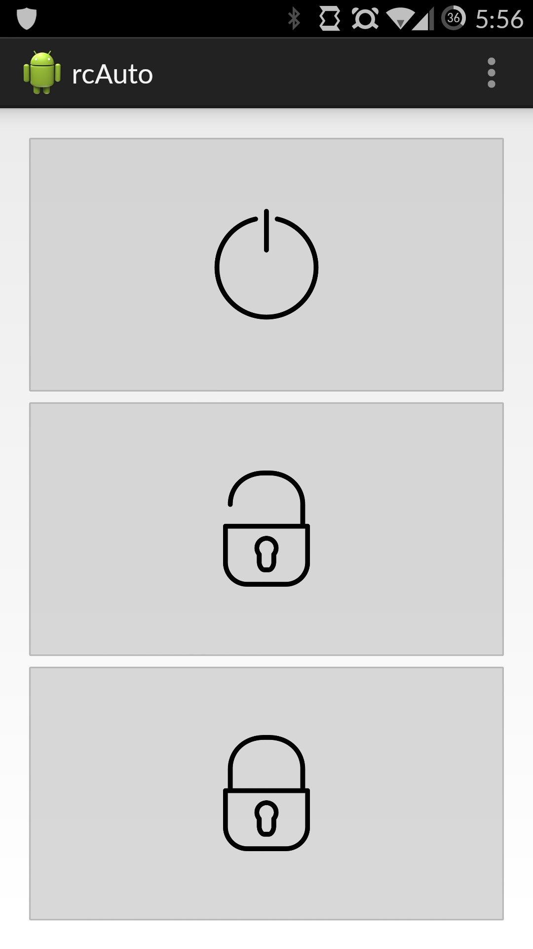 I have to thank for this part of the code to my friends and coworkers Bob Dauth and Diana Shkolnikov, who helped me a lot with C++ because I had no C++ coding experience at all. After that, it was mostly done, however, I wanted an app that with a tap of a button I could tell my car to start or to open and close the door locks. I asked my also friend and coworker David Breneisen to help me with that. He came up in less than half hour with a very simple app that does the work. Here’s a screenshot: