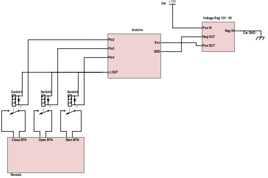 The rest of the circuit is pretty much the same as it was, just the connection from the car to power up the Arduino and the switches needed for sending the signals to the remote control of the starter. Then we need to update our code for the Arduino as follows: