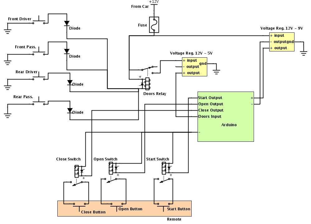 3. The signal from the Doors Relay is converted to a 12V signal so that’s why we need a voltage regulator, to convert the 12V to a 5V signal that is going to be connected to an input pin on the Arduino (we convert it to 5V because that’s what the Arduino supports).